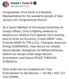 President Donald Trump has endorsed Rep. Smith for reelection in 2026. “Congressman Chris Smith is a fantastic Representative for the wonderful people of New Jersey’s 4th Congressional District!” Trump wrote Wednesday morning on Truth Social.