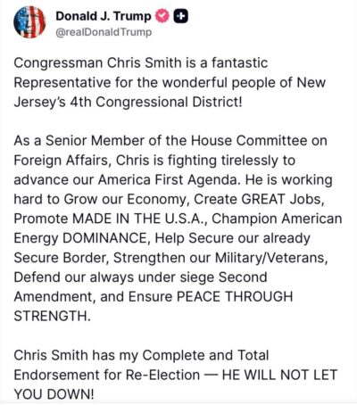 “Congressman Chris Smith is a fantastic Representative for the wonderful people of New Jersey’s 4th Congressional District!” Trump wrote Wednesday morning on Truth Social. “As a Senior Member of the House Committee on Foreign Affairs, Chris is fighting tirelessly to advance our America First Agenda.”
